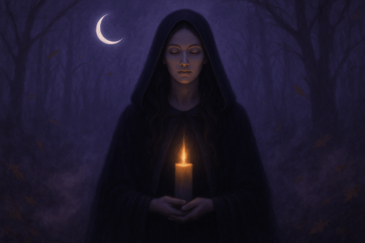 En este punto de la rueda, la Diosa se viste de sombra y se manifiesta como Hécate, Morrigan o Kerridwen, los rostros del misterio, la muerte y la transformación.